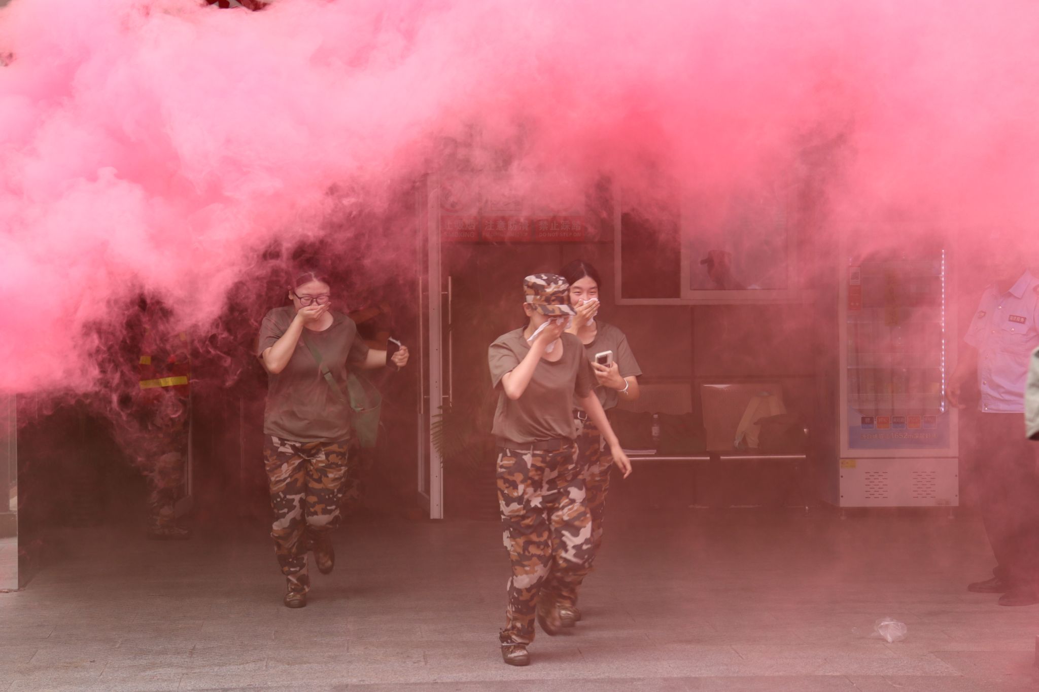 指令下达后,模拟烟雾弥漫,警铃响起。公寓值班人员迅速响应并上报火情。与A校区不同的是,B校区特邀合川区消防救援支队的消防员参与,增强了演练的真实性和专业性。