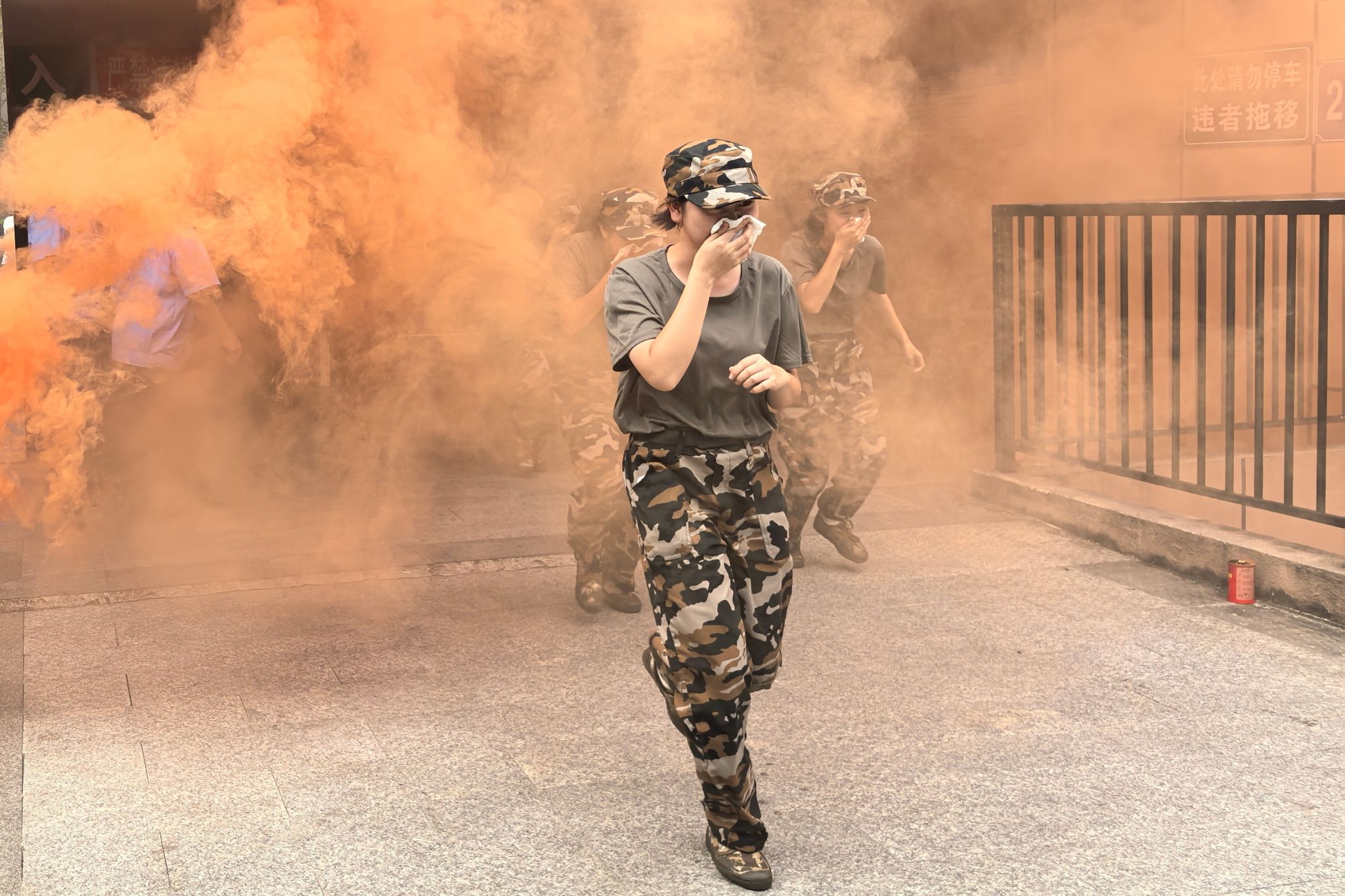 (A校区演练现场,学生用湿毛巾捂住口鼻迅速向安全区域疏散)
