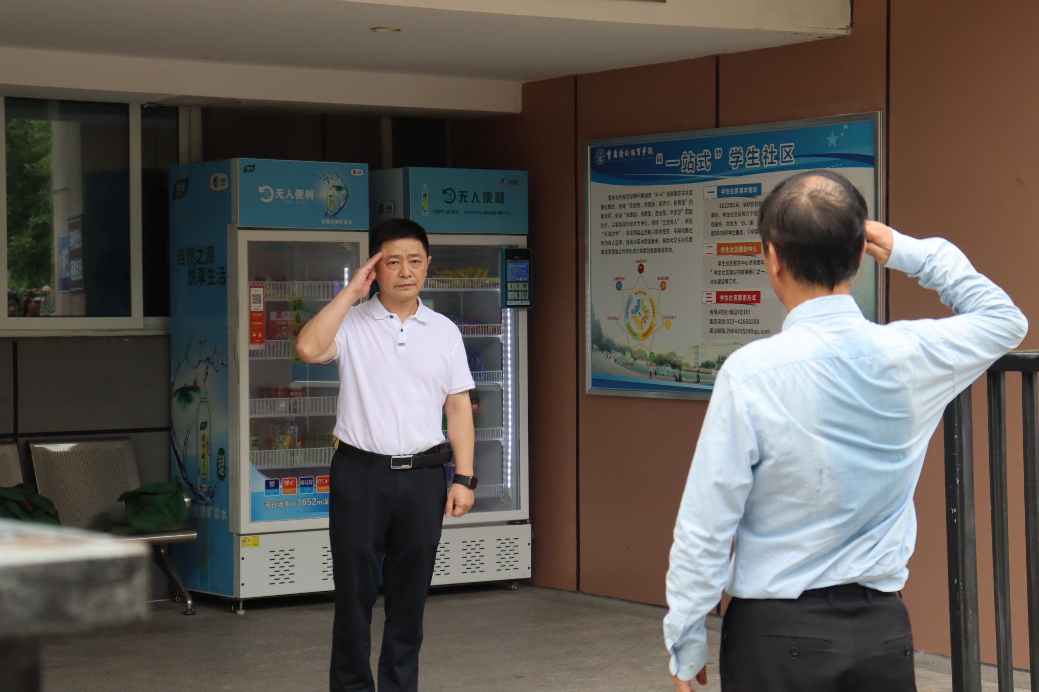 (B校区消防疏散演练指挥员张林向演练副总指挥马宁报告演练准备就绪)